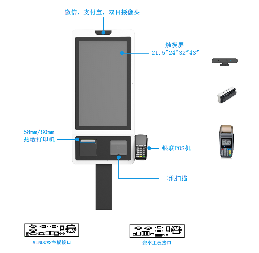 可選配件: 二維掃描器,NFC讀卡器,58/80mm熱敏打印機,76mm發(fā)票打印機