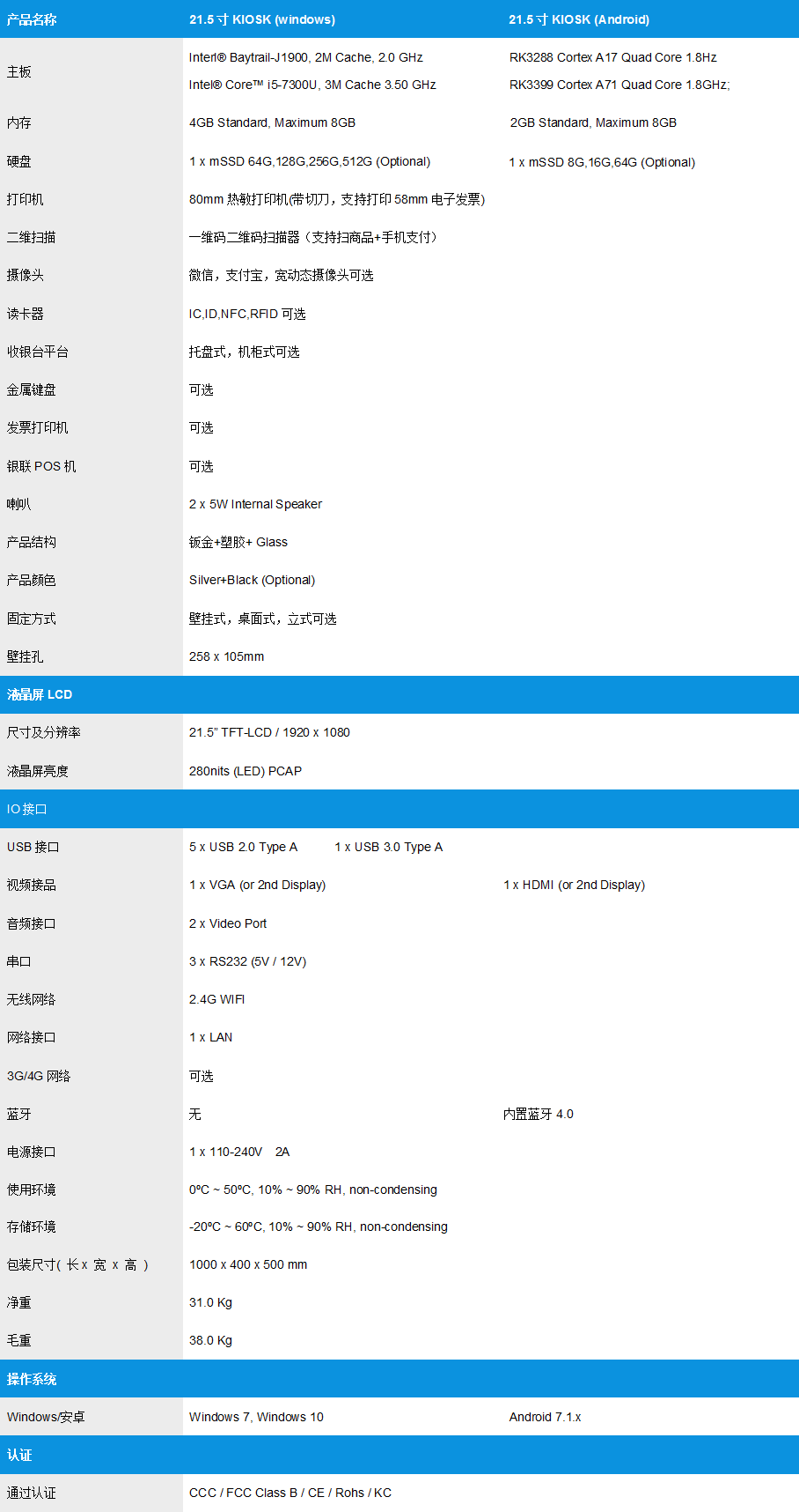 可選配件: 二維掃描器,NFC讀卡器,58/80mm熱敏打印機,76mm發(fā)票打印機